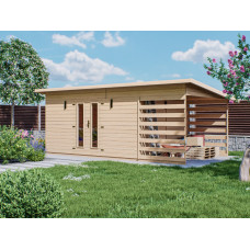 Domek LOT s dřevníkem popis:Dřevěný zahradní domeček s prostorem na dřevo. Rozměry domku 300 x 400 Cm, dřevník 300 x 150 cm. Celkové rozměry domečku včetně přesahu střechy 330 x 580 cm. Výška stěn 180-215 cm. Dvojité dveře o rozměrech 120 x 180 cm. D..