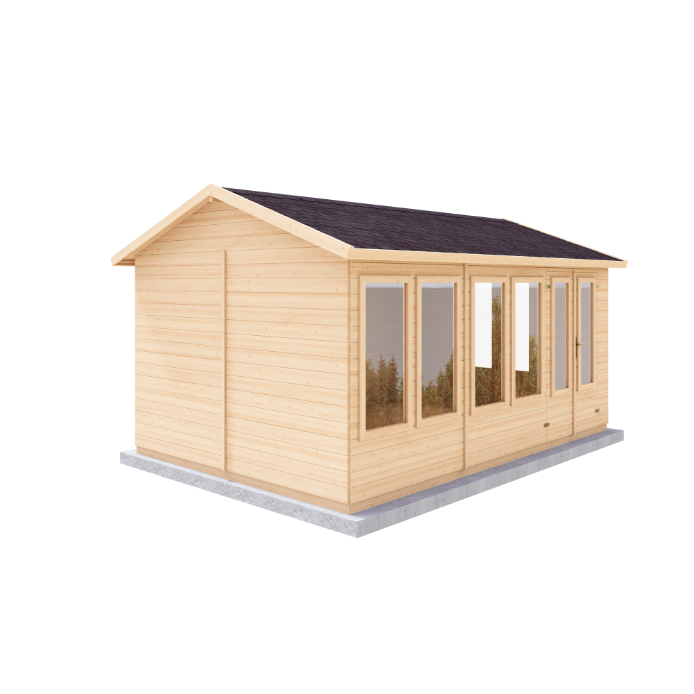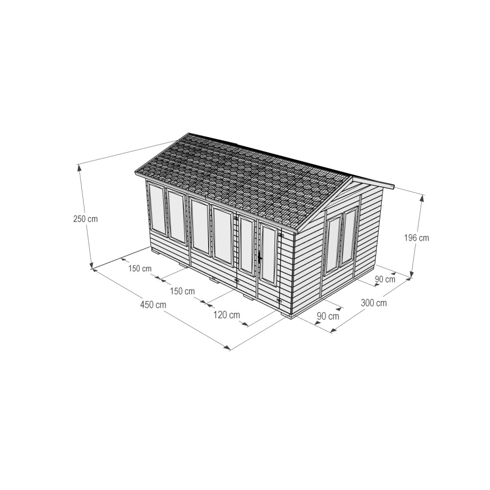 Rozměry tohoto domku včetně přesahu střechy dosahují 330 x 480 cm ( rozměry domku 300 x 450 cm), s výškou hřebene 250 cm (boční stěny mají výšku 196 cm). Tento domek je dodáván včetně podlahy a střechy. Celá konstrukce je vyrobena z kvalitních dřevěných desek severského smrku o tloušťce 15 mm, s možností doplnit silnější palubky o tloušťce 19-24 mm. Podlaha tohoto domku je tvořena dřevěnými prkny o tloušťce 24 mm, což zajišťuje pevnost a trvanlivost.
