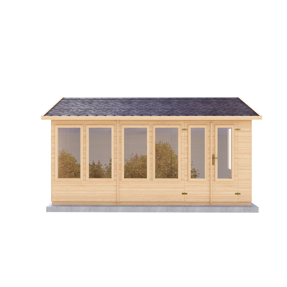 Tento model domku je vybaven dvoukřídlými dveřmi na pantech o rozměru 120 x 180 cm, přičemž každé křídlo je osazeno oknem o rozměrech 40 x 140 cm. Díky petlici lze dveře uzamknout visacím zámkem (můžete si také objednat vložkový zámek a kování pro další bezpečnost). Další okna o rozměru 50 x 140 se nachází ve přední stěně domku. Všechna okna jsou vybavena prosklením z plexiskla.
