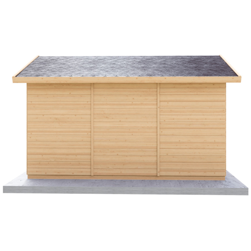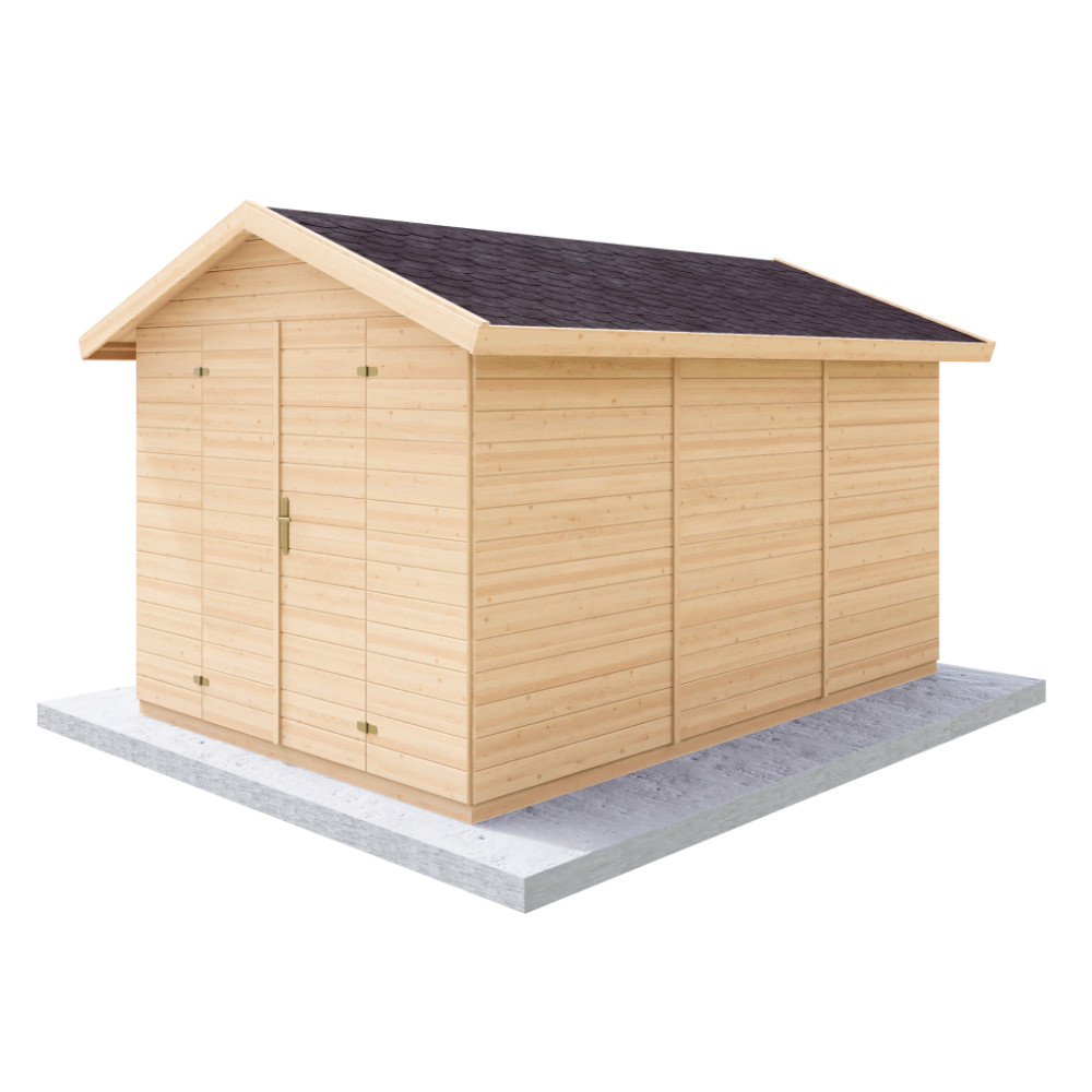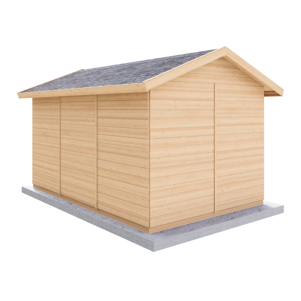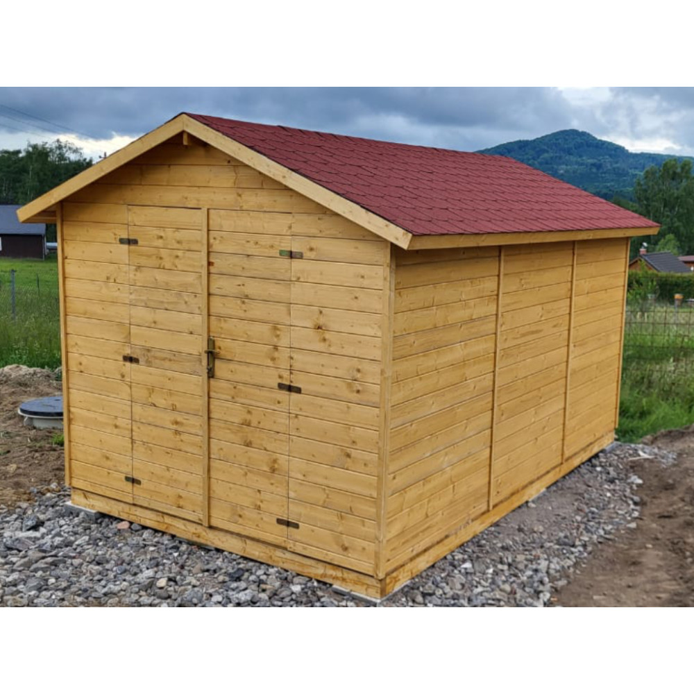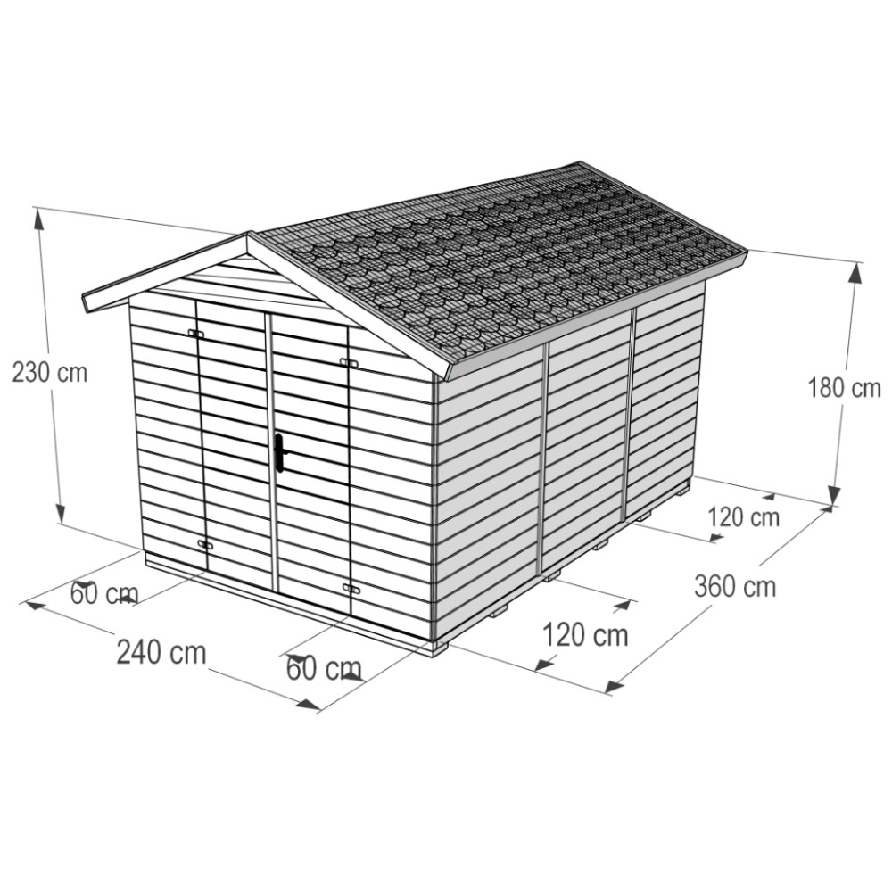 "Kvalitní dřevěný zahradní domek o rozměrech 240 x 360 cm. Výška stěn činí 180 cm a celková výška domku je 230 cm. Domek je vyroben z smrkových palubek o tloušťce 15 mm, 19 mm nebo 24 mm. Domek má také dvoukřídle dveře o rozměrech 120 x 180 cm. Je taky možnost přidat okna, nebo změna rozměrů.