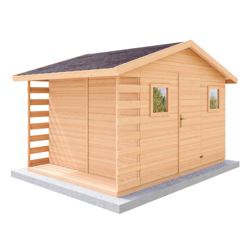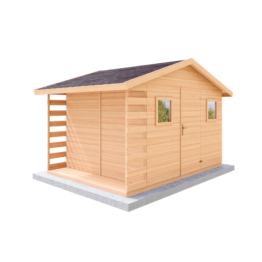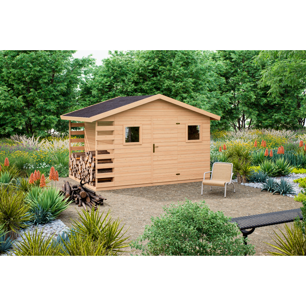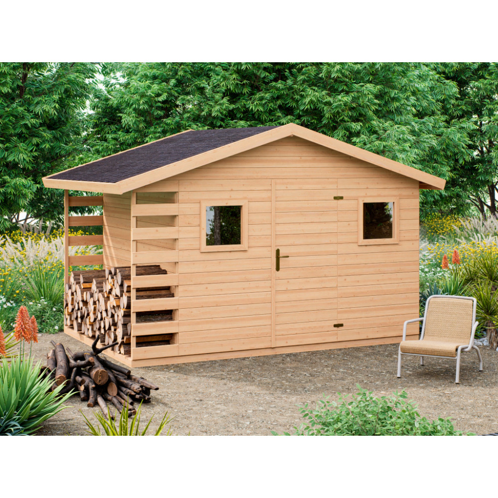 Zahradní domek LERA s dřevníkem je ideálním spojením úložného prostoru a přístřešku na dřevo. Nabízí perfektní řešení pro uskladnění zahradního nářadí, techniky, kol nebo sezónních věcí, zatímco boční přístřešek slouží k uskladnění palivového dřeva. Díky svému funkčnímu designu šetří místo a zároveň udržuje vaši zahradu upravenou.