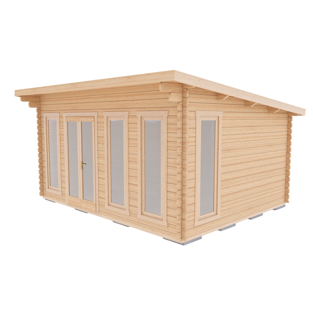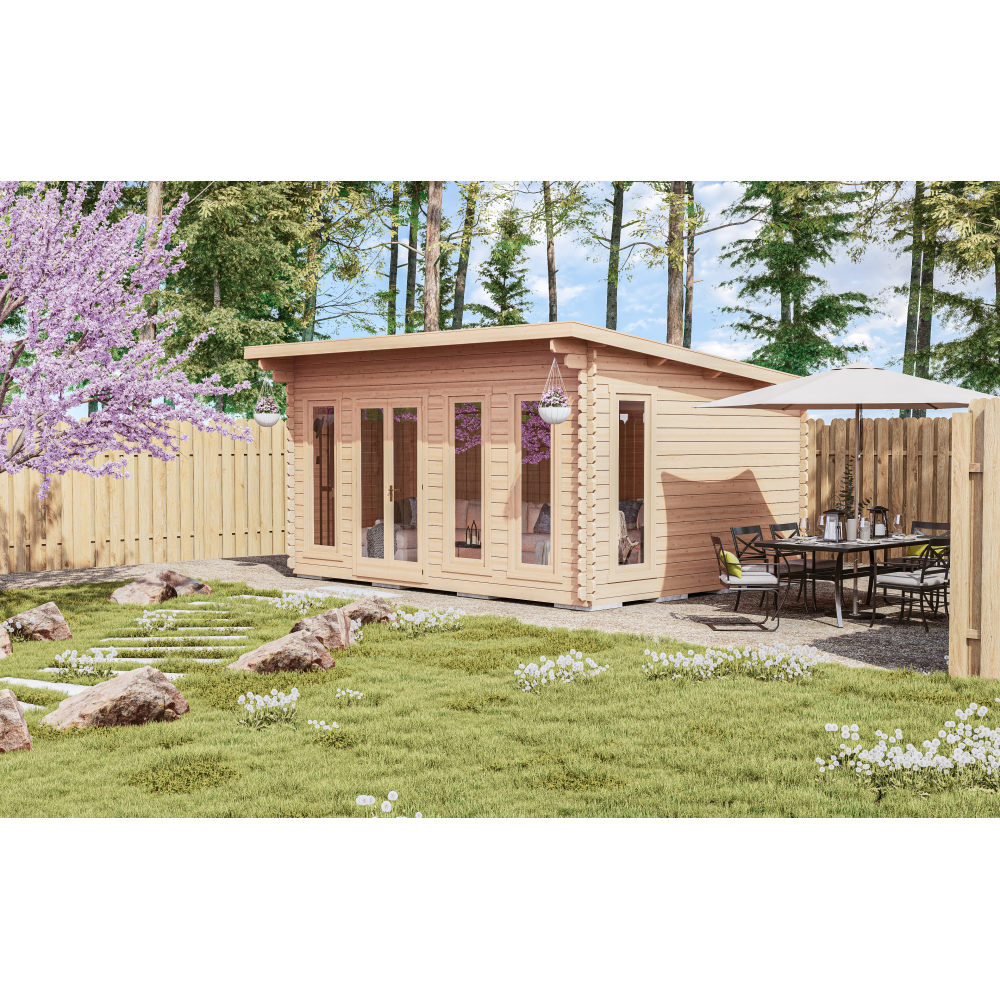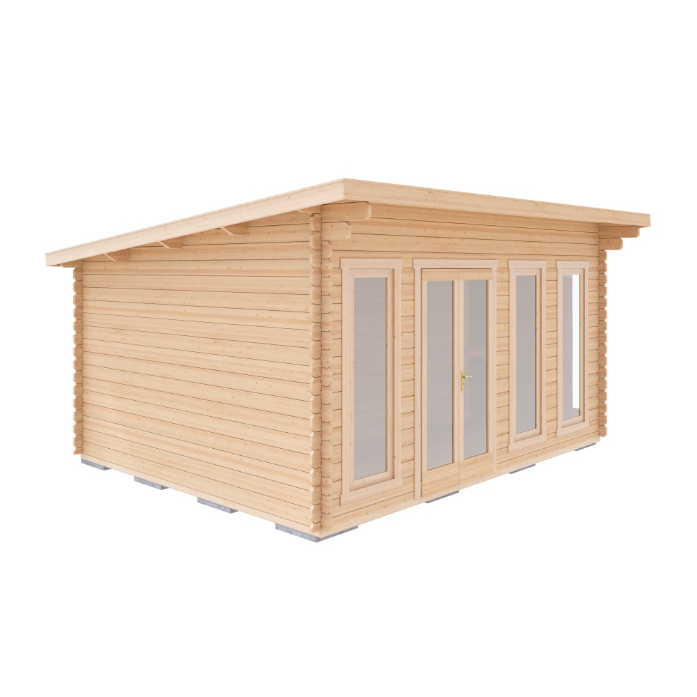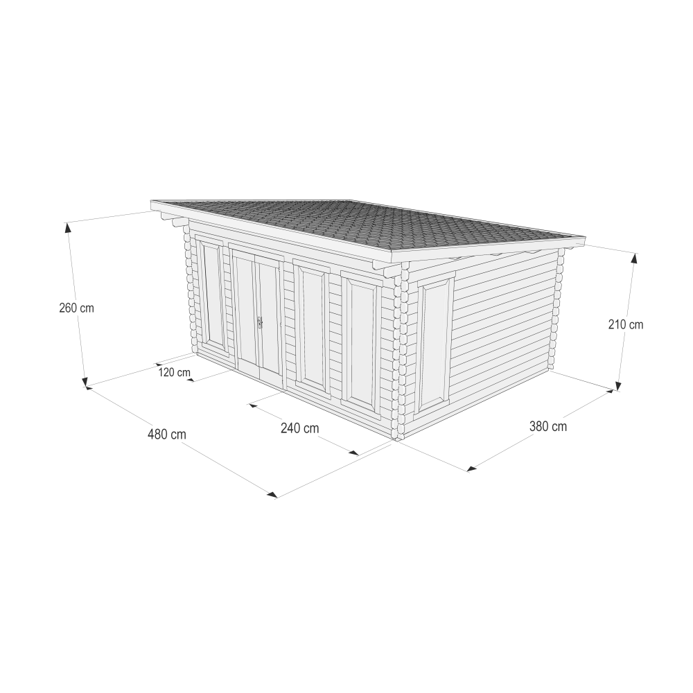 "Tato zahradní dřevěná chatka PEPPA je vyrobena z oboustranných hladkých smrkových palubek o tloušťce 24 nebo 40 mm. Chatka má rozměry 500 x 400 cm. Přední část chatky má výšku 260 cm a zadní část 210 cm. Chatka je vybavena dvojitými zasklenými dveřmi o rozměrech 120 x 200 cm. Kromě toho má chatka 4 okna o rozměrech 60 x 200 cm. Okna a dveře jsou mají vyplň z průhledného plexiskla.