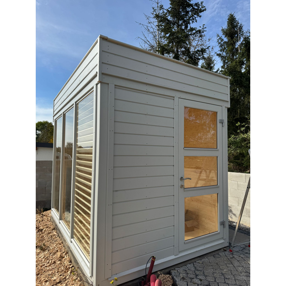Minimalistický moderní styl ve skandinávském duchu — sauna nepůsobí těžkopádně, ale elegantně a harmonicky s okolím (zahrada, terasa, dvůr).