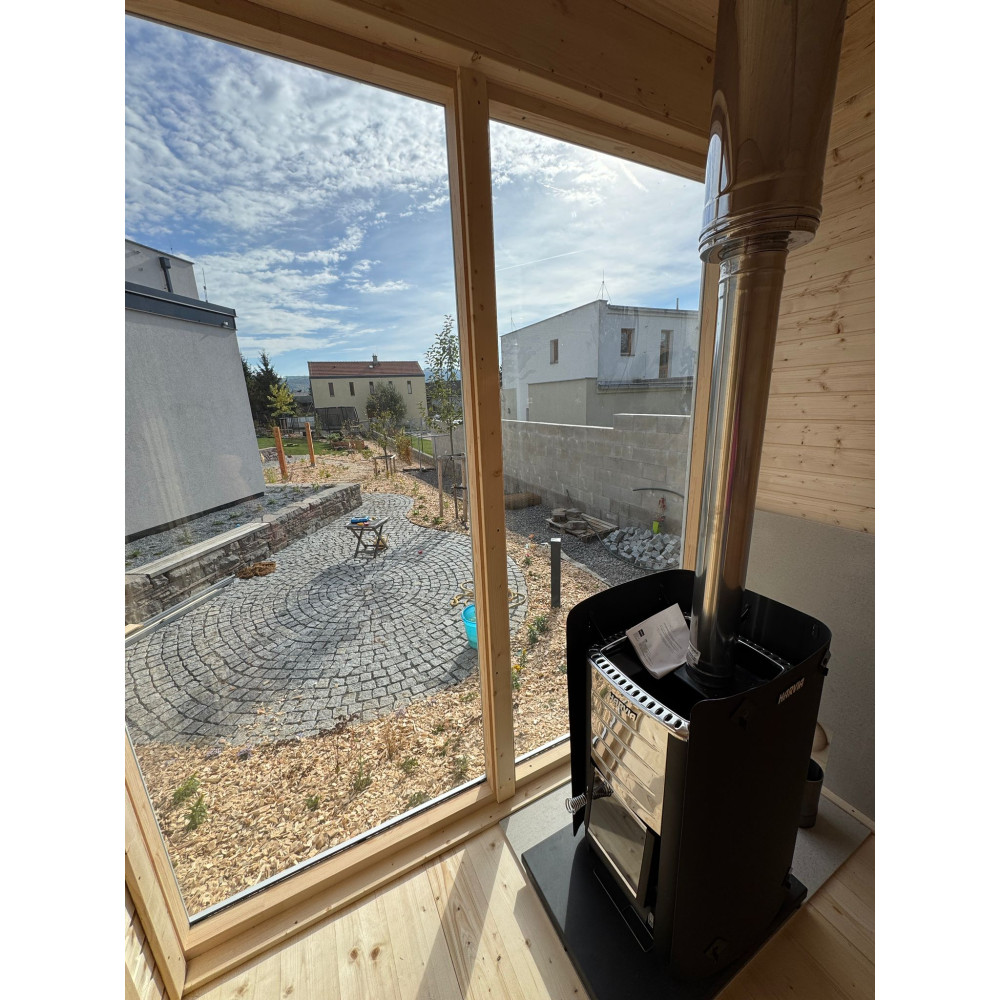 Skleněné panely dodávají sauně vzdušnost, světlo a propojení s exteriérem — tedy nejen praktickou, ale i estetickou hodnotu.