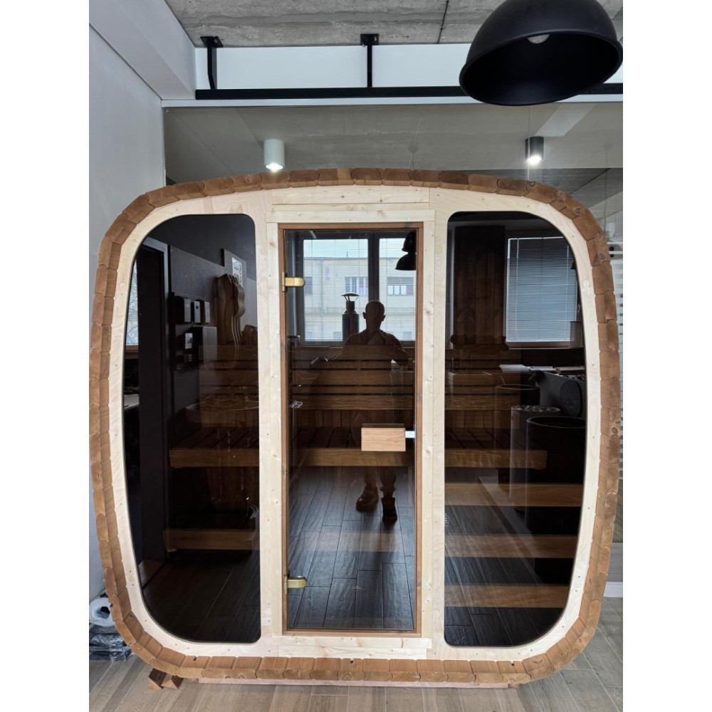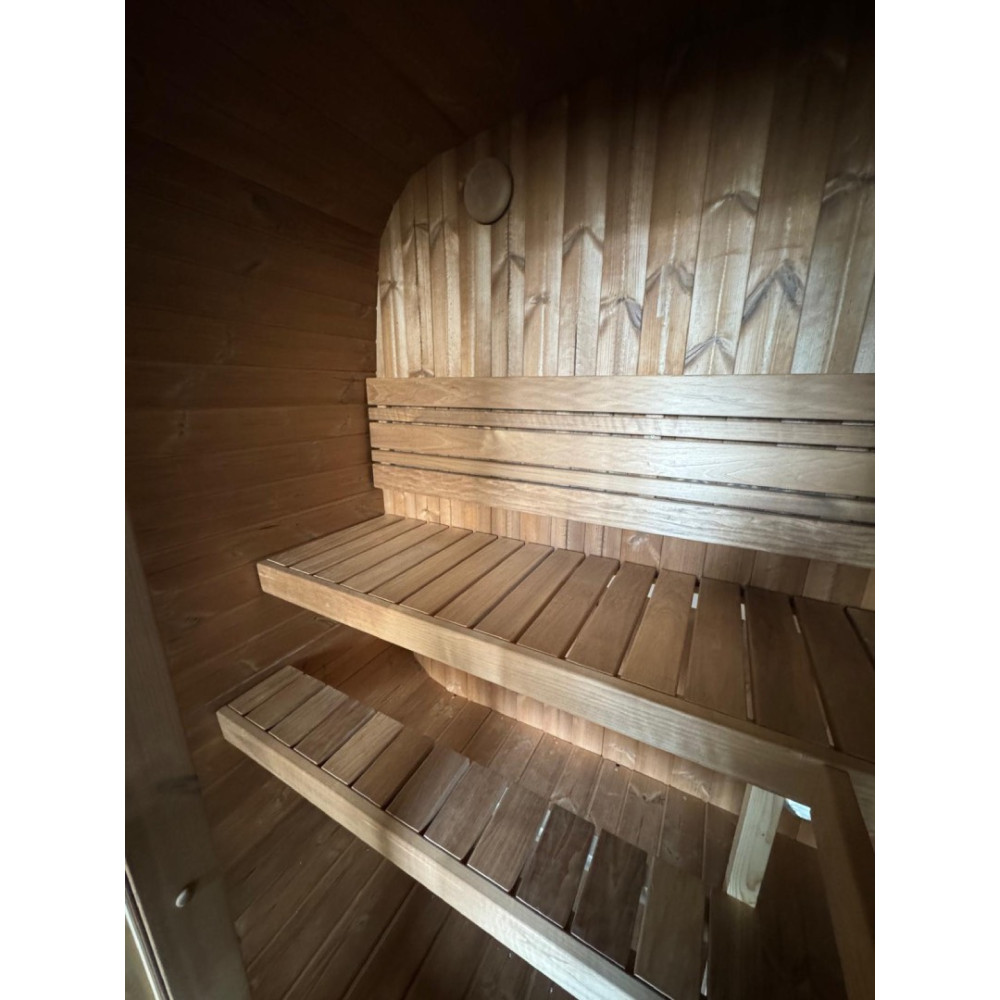 Zaoblený tvar zajišťuje efektivní cirkulaci tepla a příjemné klima uvnitř sauny. Použité materiály jsou pečlivě vybrané s důrazem na dlouhou životnost, stabilitu a komfort při saunování.
