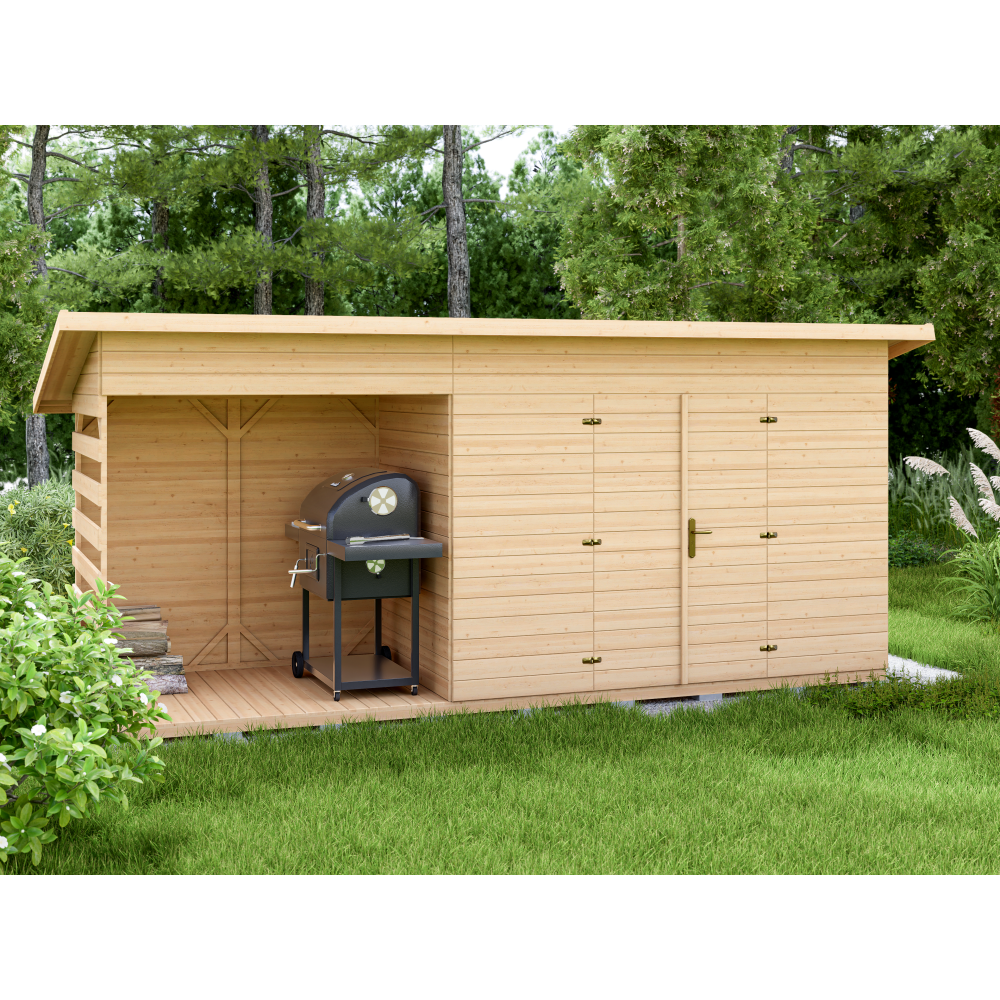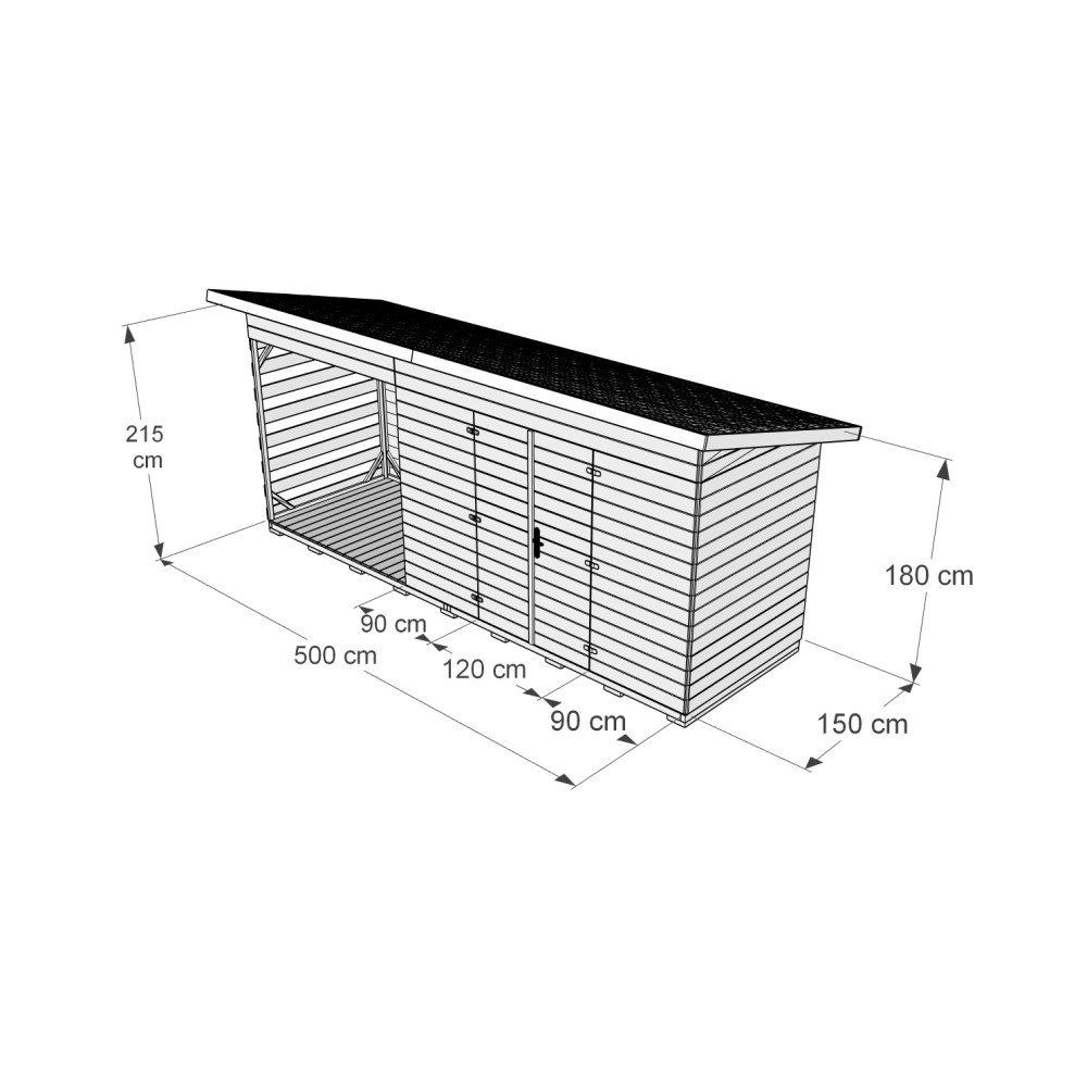 Dřevník s malým domkem nabízí praktický prostor pro ukládání dřeva a mnoho dalšího. Celkové rozměry tohoto dřevníku činí 5,3 metru na šířku, 1,8 metru na hloubku a výšku střechy je 215 centimetrů. Střecha je opatřena asfaltovou krytinou, což zajišťuje ochranu dřeva před povětrnostními vlivy.