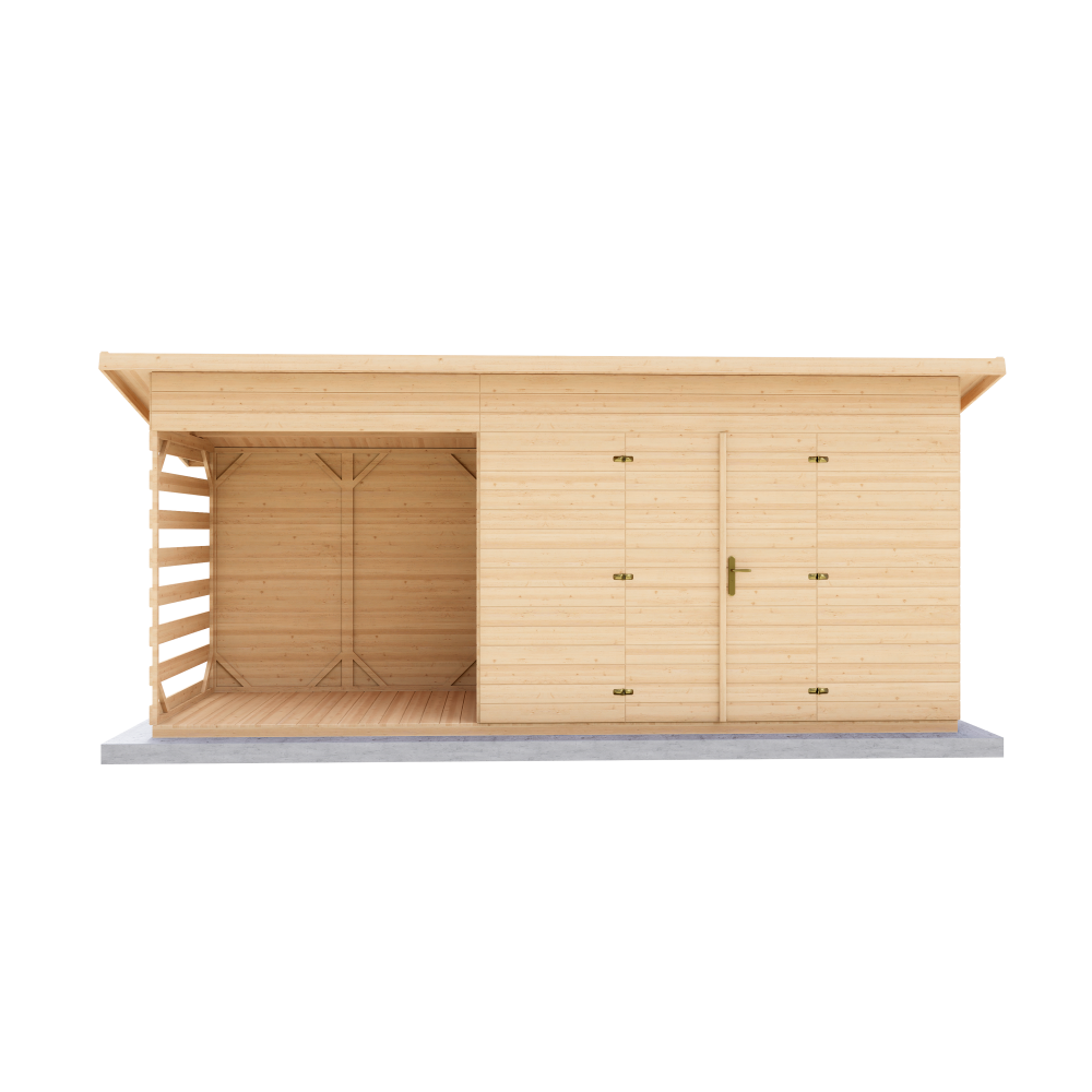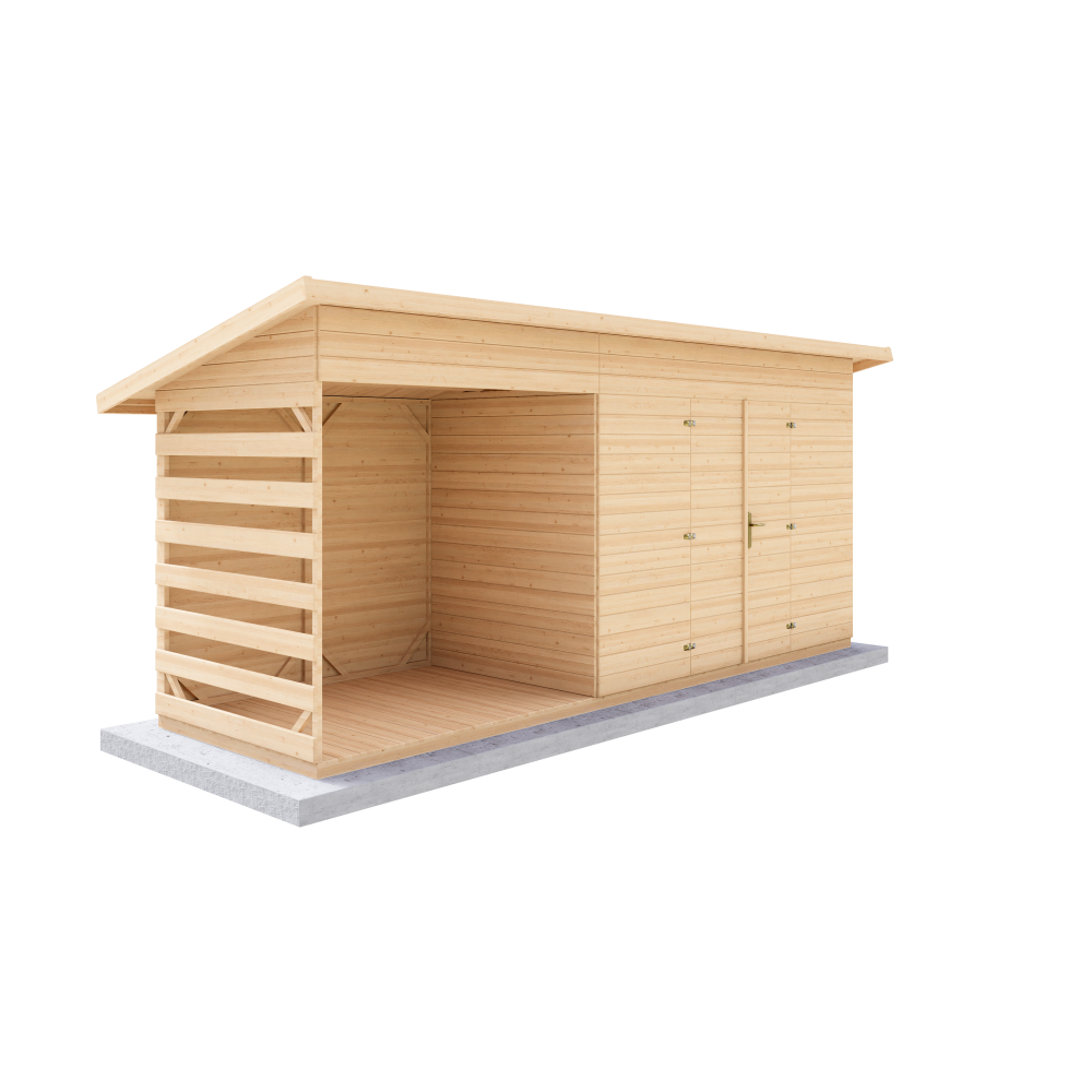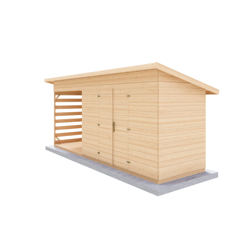 Dřevník je kompletně vyroben z kvalitních palubových prken o tloušťce 15 mm/19 mm/24 mm, přičemž můžete vybrat tloušťku dle vašich preferencí. Dodává se v rozebraném stavu a zahrnuje kompletní instalační materiál, takže není potřeba dokupovat žádné další součásti. Tento dřevník lze využít jako zahradní domek, domek na nářadí, kůlnu nebo zahradní chatku.