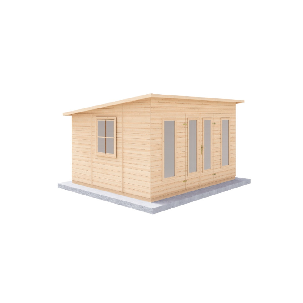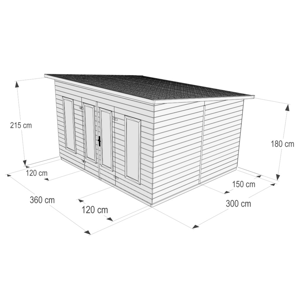 Nový zahradní dřevěný domek "Klára" na nářadí, s maximálními rozměry 3,3 m x 3,9 m x výškou 2,15 cm, nabízí praktický prostor pro vaše zahradní nářadí a náčiní. Jeho podlahová plocha činí 3 x 3,6 metrů, což je 10,8 m2. Tento domek je vybaven podlahou a střechou, na které se nachází asfaltová krytina pro ochranu před povětrnostními vlivy.